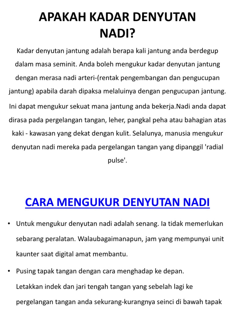 Tubuh memberikan semua kuasa untuk mencipta kehidupan baru. Walaupun kebanyakan individu tahu akan kadar degupan jantung normal dan denyutan nadi mereka sepanjang hari namun tidak semua tahu berkenaan dengan kadarnya ketika rehat. Medic sakit dada dan gastrik dr safari elis. Kadar nadi bergantung kepada kadar denyutan jantung, menyebabkan turun naik di dinding arteri. Periksa kadar denyutan jantung anda secara manual. Ikuti artikel ini untuk mengetahui kepentingan memeriksa denyutan nadi sewaktu anda berehat. Jumlah nadi seseorang boleh berbeza dari orang lain. Excercisesanddiet.info even though they belonged to the canon or compilation from scripture because the moment from the old congregation, the protestant holy book rejects all of them. Denyut nadi yang rendah biasanya terjadi jika kita sedang beristirahat, dan meningkat. Ia juga mungkin menjadi petunjuk bahawa masalah lain berlaku dalam tubuh seperti jangkitan atau keadaan metabolik. Kadar denyutan nadi sains kssm t4: Para atlet yang kuat bersukan akan mempunyai denyutan nadi lebih rendah daripada normal. Tips kesihatan kadar denyutan nadi anda (wajib tahu).