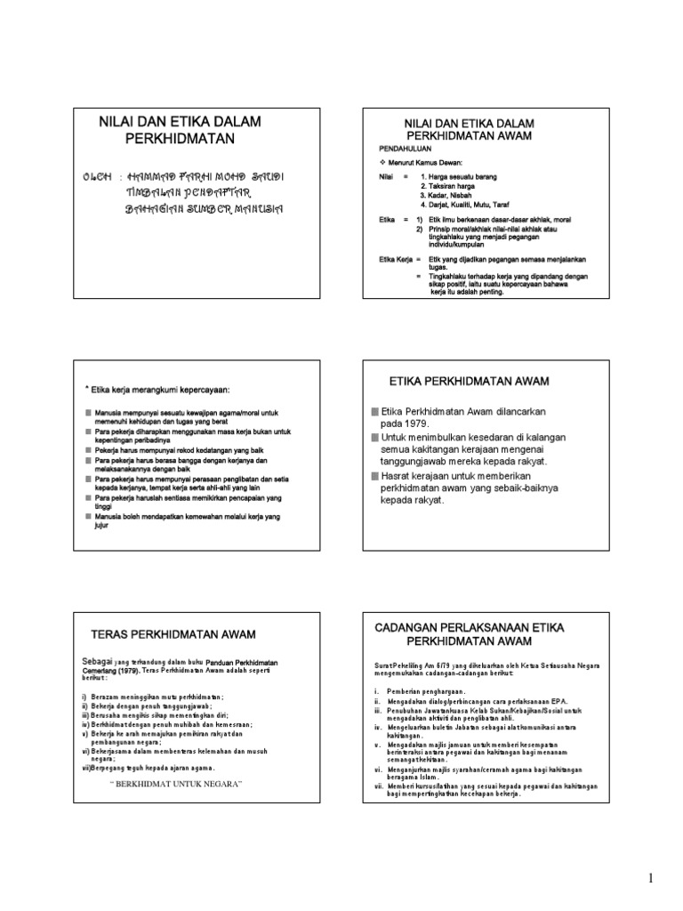 Kualiti sumber manusia penting dalam pembangunan negara. Jenayah ini akan meningkatkan kos barangan dan perkhidmatan yang akhirnya memberi kesan kepada pengguna. Seseorang anggota perkhidmatan awam berkewajipan memahami tanggungjawab terhadap peranan dan perilaku seseorang pekerja dalam kerajaan. Memberikan perkhidmatan yang berkesan, cekap , produktif dan mencukupi. Kursus asas komponen komputer dan baik pulih. Perkhidmatan awam malaysia bertaraf dunia = towards a world class malaysian civil service : Nilai dan etika dalam perkhidmatan awam. Keberkesanan prinsip etika terletak pada individu itu sendiri. 1nilai dan etika kerja perkhidmatan awam. An edition of nilai dan etika dalam perkhidmatan awam (1991). Yang dimaksud disini adalah kode etik. Etika perkhidmatan awam terkandung dalam tonggak dua belas iaitu, menghargai masa, ketekunan membawa kejayaan, keseronokan. Anggota perkhidmatan awam, disamping perlu memiliki nilai dan sikap yang positif, seharusnya juga mencari pendekatan baru bagi meningkatkan kepakaran agar.