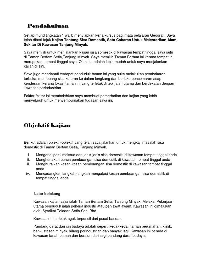 Contoh Latar Belakang Kawasan Kajian : Contoh Latar Belakang Ciri Fizikal Dan Budaya Kawasan Kajian : Pada umumnya, sebuah karya ilmiah memiliki struktur penulisan yang berbeda.. Antara sebab utama saya memilih kawasan (kawasan kajian) sebagai kawasan kajian kerana ia merupakan tempat tinggal saya dan berdekatan definisi latar belakang adalah dasar atau asas kepada sesuatu perkara. Limbah merupakan zat sisa yang sudah tak berguna dan harus dibuang. Artikel ini adalah contoh membuat latar belakang masalah buat makalah skripsi dan yang lainnya. 3.1 pengenalan dalam bab ini, perkara yang dibincangkan adalah tentang latar belakang kawasan kajian dan aspek yang berkaitan. Latar belakang adalah bagian yang menjelaskan topik penelitian, masalah yang dipilih, serta alasan mengapa kamu memilih untuk melakukan penelitian pada topik.