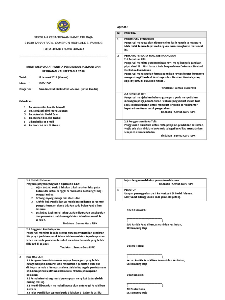Minit Mesyuarat Rmt 2018 Kali Pertama from imgv2-2-f.scribdassets.com Pn khalifah bt khalib gbksm 3. Bilik gerakan smk jerantut kehadiran. Minit mesyuarat kesihatan kali 2 2018. Bilik gerakan sksu kehadiran : Pn sharmila bt shahrom 3. 29 disember 2017 hari : Selasa agenda mesyuarat kewangan kali ke 2/ 2018: Ismail bin mohmd dan ldp 1 disampaikan oleh pn aliati khairulnisyak binti ismail, penyelia unit taterertib dan keutuhan jpn melaka.